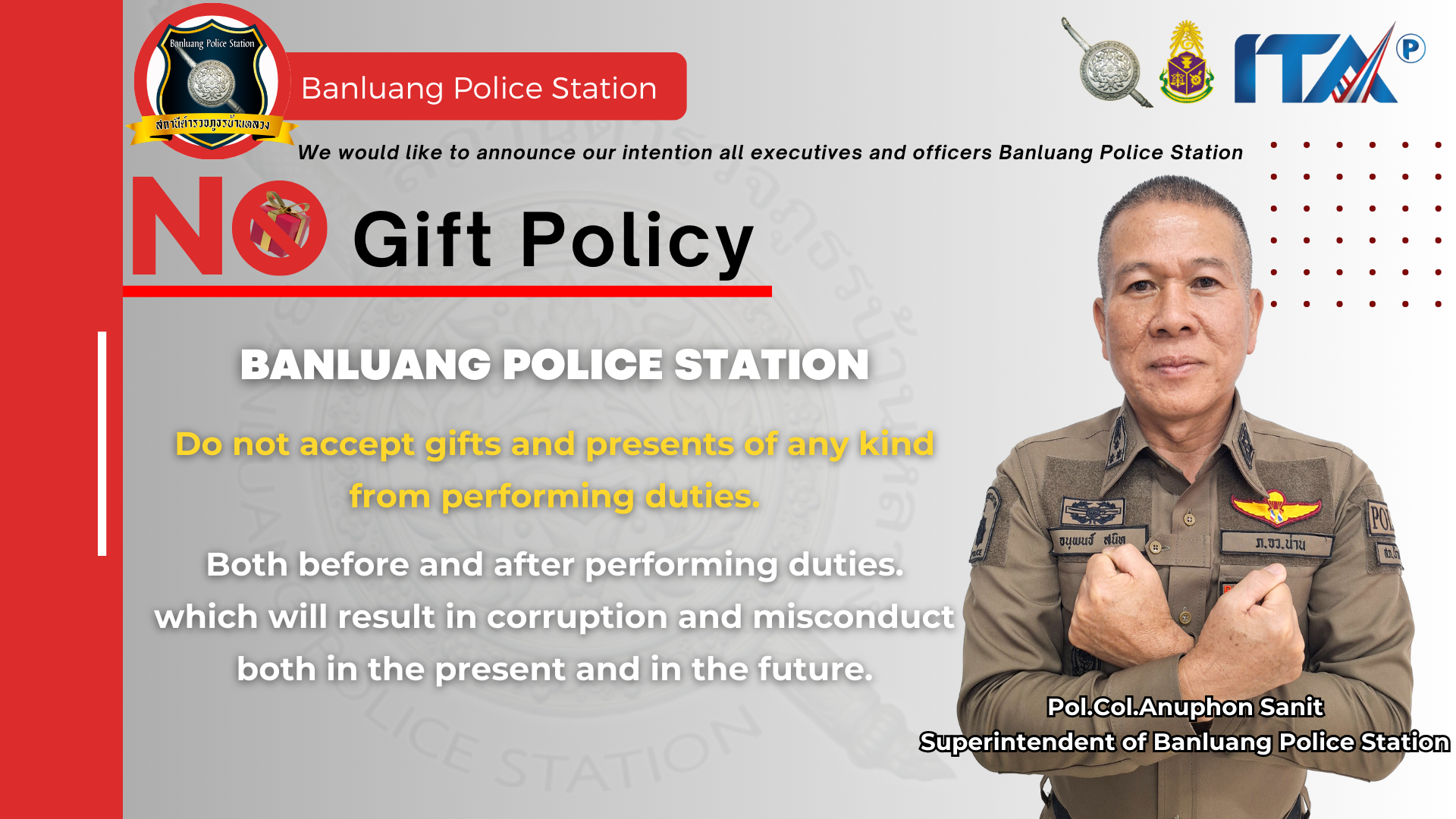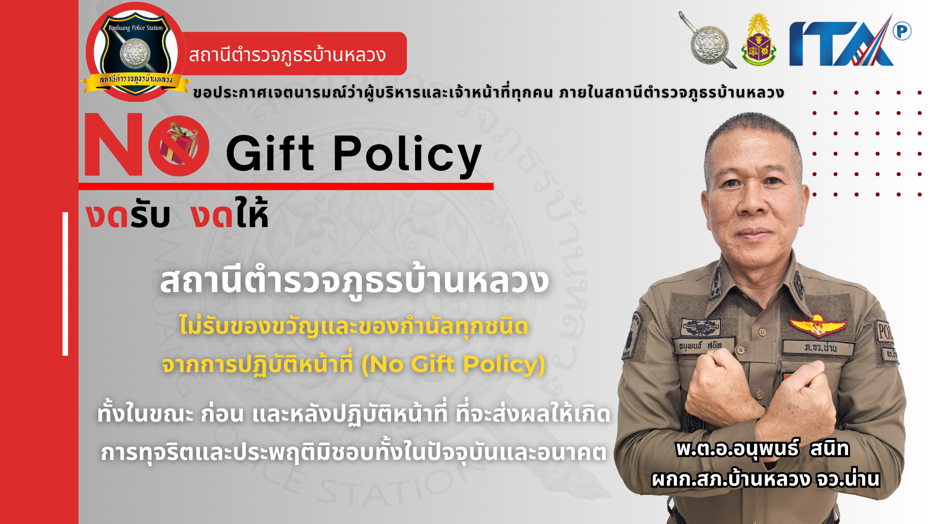 ว่าที่ พ.ต.อ.อนุพนธ์ สนิท ผกก.สภ.บ้านหลวง ประกาศเจตนารมณ์ของหน่วยงาน ประกาศเจตนารมณ์ ในการป้อง