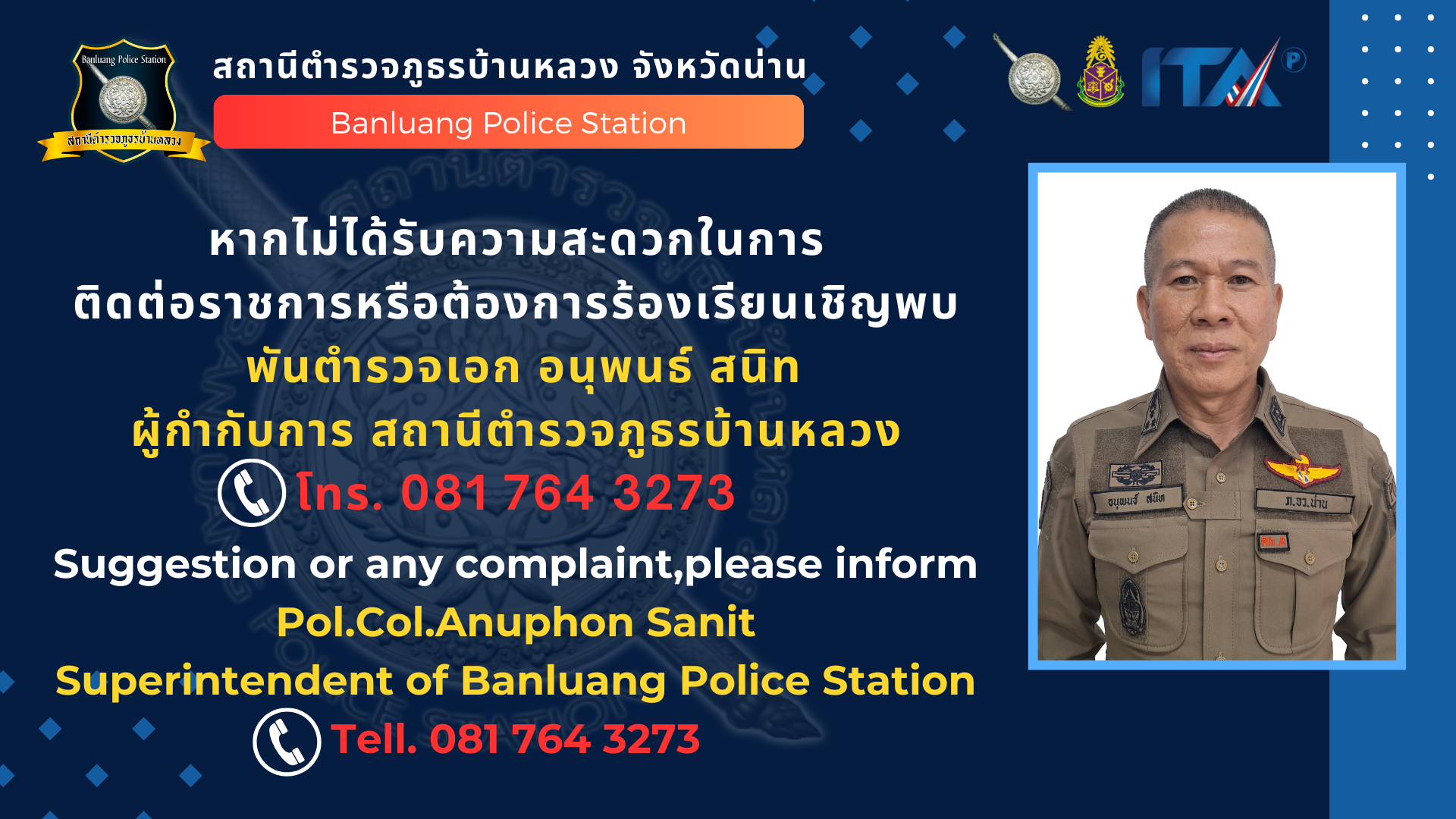 ว่าที่ พันตำรวจเอก อนุพนธ์ สนิท ผู้กำกับการ สถานีตำรวจภูธรบ้านหลวง มอบหมายให้ พันตำรวจโท เจษฎา