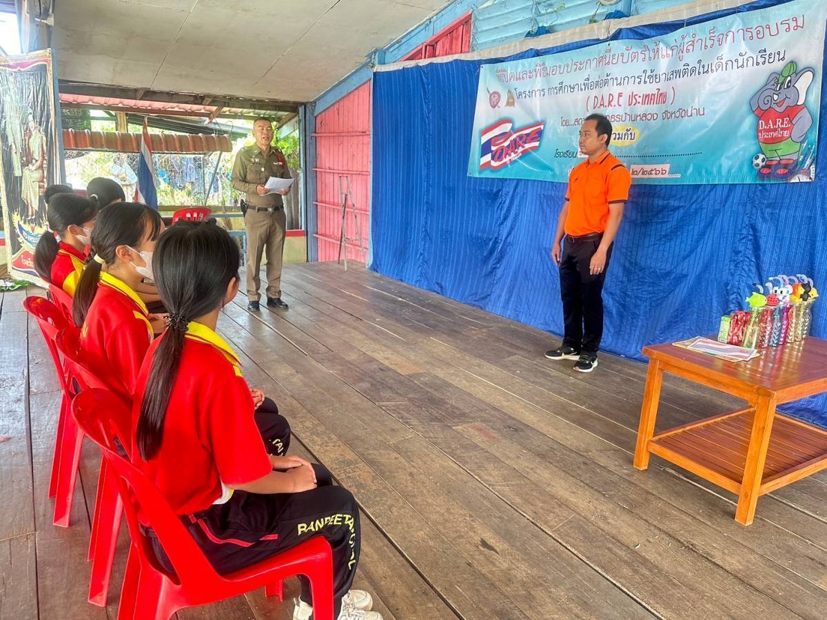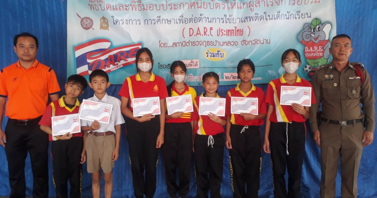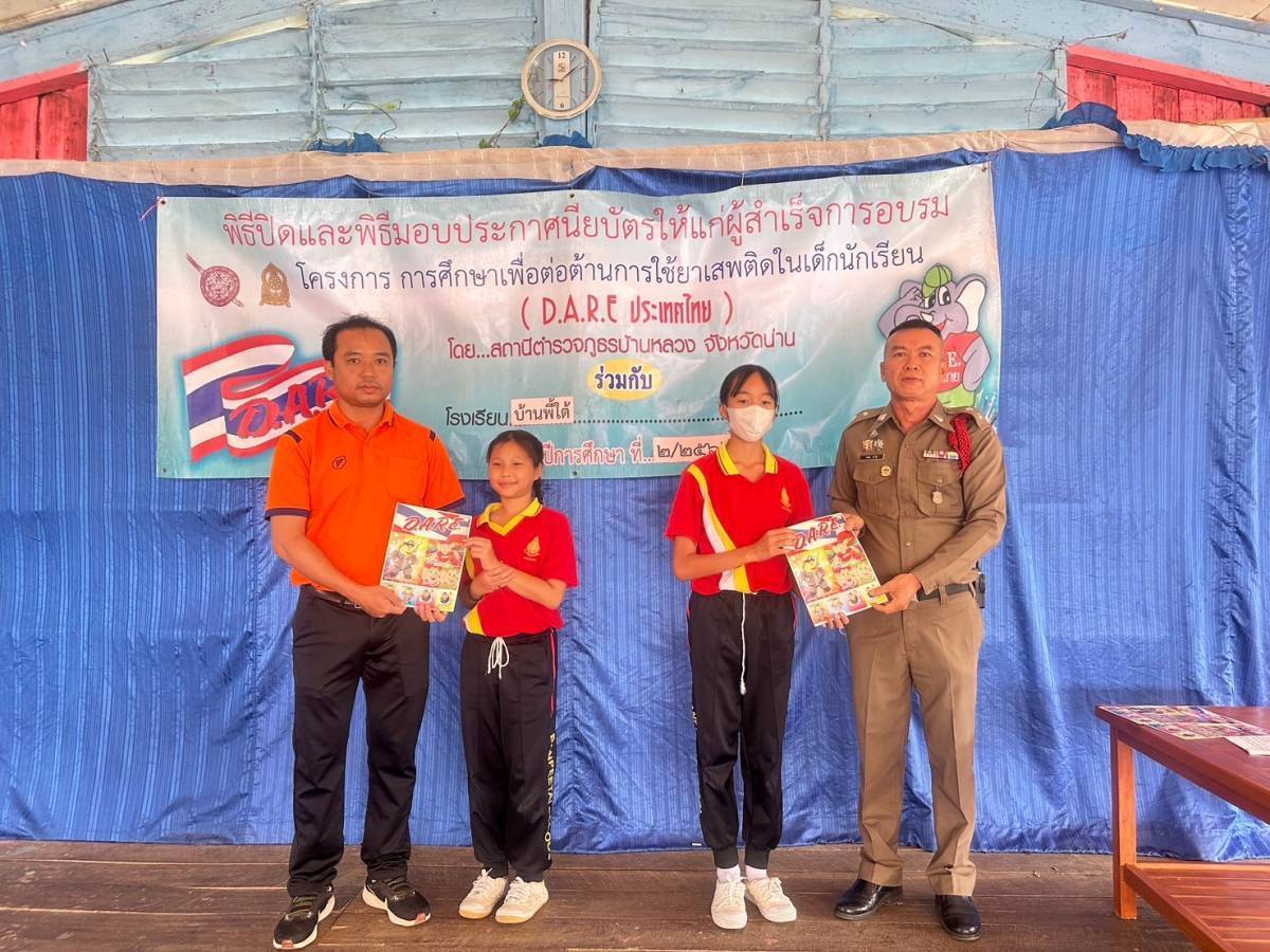 สภ.บ้านหลวง จว.น่าน วันที่ 21 มึ.ค.2567 เวลา 09.00-10.00 น. โดยการอำนวการของ พ.ต.อ.ธานินทร์ แสวงไวศยสุข ผกก.สภ.บ้านหลวง ได้มอบหมายให้ขัาฯ ร.ต.ท.ผจญ มาฟู รองสว.(ป.)ฯ ครูตำรวจแดร์ รหัส 6938 ได้เข้าร่วมกิจกรรมมอบประกาศนียบัตรให้กับนักเรียนที่ผ่านการฝึกอบรม ตามโครงการแดร์ของโรงเรียนบ้านพี้ใต้ ประจำปีการศีกษาที่ 2/2566 ชั้น ป.5 จำนวนนักเรียน 7 คน โดยได้รับความร่วมมือจากคณะครูและนักเรียนเป็นอย่างดี