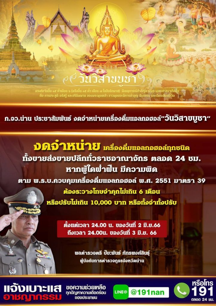 สภ.บ้านหลวง ภ.จว.น่าน วันนี้ (2 มิ.ย.66) เวลา 19.00 น. โดยการอำนวยการของ พ.ต.อ.ธานินทร์ แสวงไวยศสุข ผกก.สภ.บ้านหลวง , พ.ต.ท.เจษฎา ปิ่นชูทอง รอง ผกก.ป.ฯ , พ.ต.ต.จักร์กิต วุฒิโอสถ สวป.ฯ ได้มอบหมายให้ ร.ต.อ.สัมพันธ์ กล้าหาญ รอง สวป.ฯ ปฏิบัติหน้าที่ร้อยเวร 20 พร้อมลูกชุด ออกประชาสัมพันธ์ร้านค้าและสถานประกอบการในพื้นที่ให้งดจำหน่ายสุรา เนื่องในวันวิสาขบูชา ตั้งแต่เวลา 24.00 น. ของวันที่ 2 มิ.ย.66 ถึงเวลา 24.00 น. ของวันที่ 3 มิ.ย.66