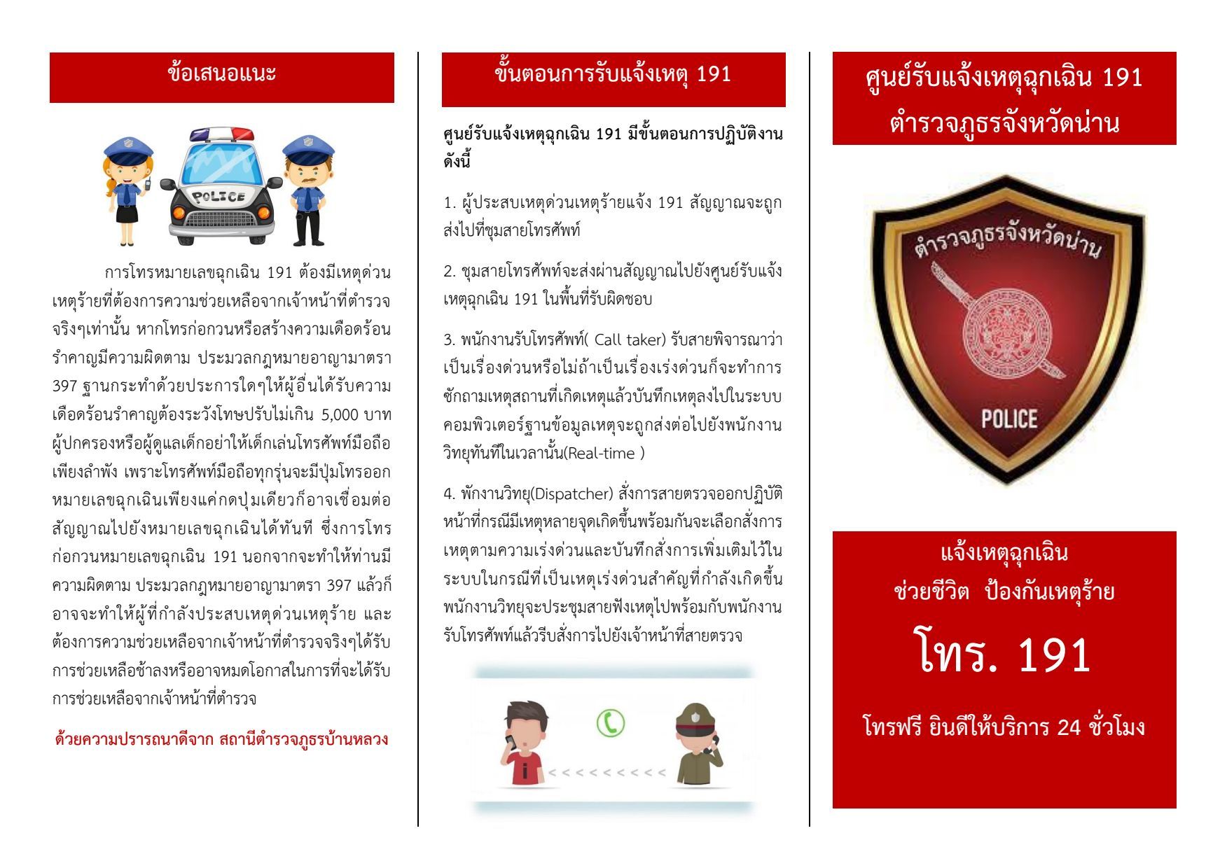สภ.บ้านหลวง ภ.จว.น่าน วันที่ 2 มิถุนายน 2567 เวลา 12.40 น. ร้อยเวร 20 พร้อมสายตรวจรถยนต์ออกประชาสัมพันธ์แจกแผ่นพับการรับแจ้งเหตุฉุกเฉิน 191 ผ่านช่องทางต่างๆ ตามโครงการศูนย์รับแจ้งเหตุฉุกเฉิน 191 ดีเด่น ประจำปี 2567