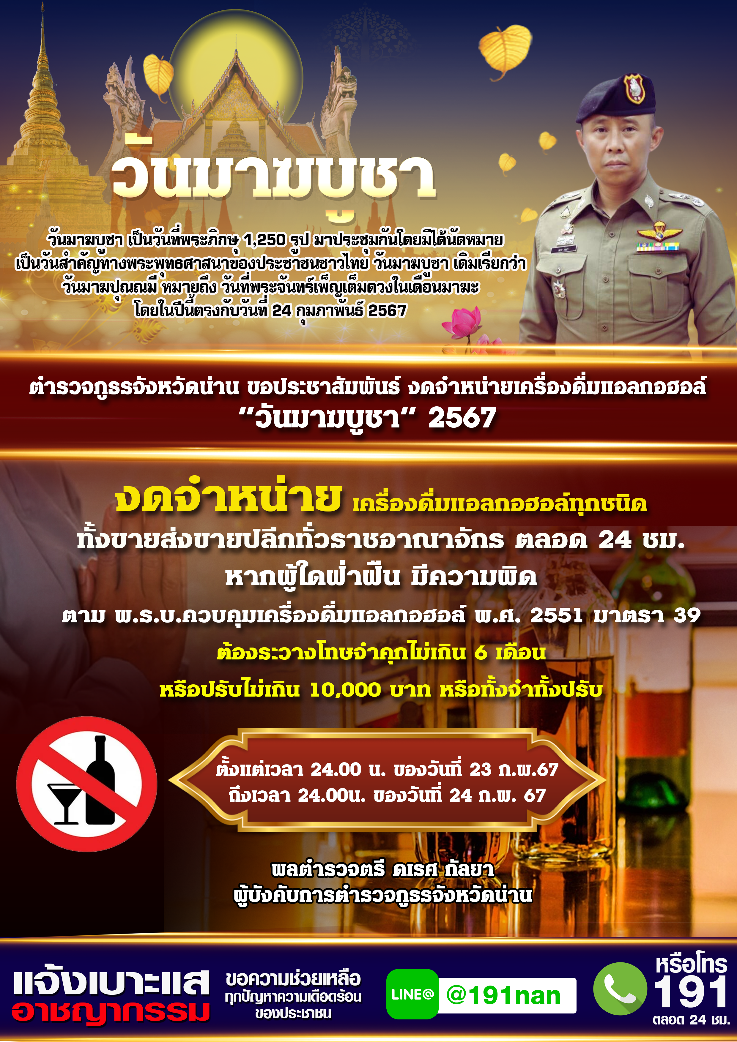 เนื่องในโอกาสวันสำคัญทางพระพุทธศาสนา ‘วันมาฆบูชา’ สำนักงานตำรวจแห่งชาติ แจ้งเตือนไปยังผู้ประกอบการร้านค้า และประชาชน ให้งดจำหน่ายและดื่มเครื่องดื่มแอลกอฮอล์ทุกชนิด ทั่วราชอาณาจักร ตลอด 24 ชั่วโมงตั้งแต่เวลา 24.00 น. ของวันที่ 23 ก.พ. 67 ถึงเวลา 24.00 น. ของวันที่ 24 ก.พ.67 หากผู้ใดฝ่าฝืนมีความผิดตาม พ.ร.บ.ควบคุมเครื่องดื่มแอลกอฮอล์ พ.ศ. 2551 มาตรา 39 ต้องระวางโทษจำคุกไม่เกิน 6 เดือน หรือปรับไม่เกิน 10,000 บาท หรือทั้งจำทั้งปรับ