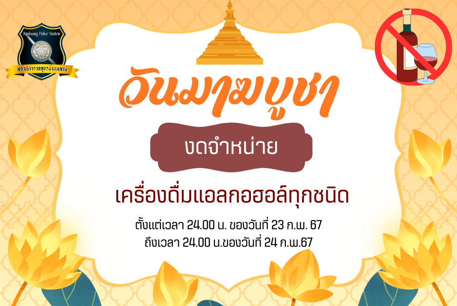 เนื่องในโอกาสวันสำคัญทางพระพุทธศาสนา ‘วันมาฆบูชา’ สำนักงานตำรวจแห่งชาติ แจ้งเตือนไปยังผู้ประกอบการร้านค้า และประชาชน ให้งดจำหน่ายและดื่มเครื่องดื่มแอลกอฮอล์ทุกชนิด ทั่วราชอาณาจักร ตลอด 24 ชั่วโมงตั้งแต่เวลา 24.00 น. ของวันที่ 23 ก.พ. 67 ถึงเวลา 24.00 น. ของวันที่ 24 ก.พ.67 หากผู้ใดฝ่าฝืนมีความผิดตาม พ.ร.บ.ควบคุมเครื่องดื่มแอลกอฮอล์ พ.ศ. 2551 มาตรา 39 ต้องระวางโทษจำคุกไม่เกิน 6 เดือน หรือปรับไม่เกิน 10,000 บาท หรือทั้งจำทั้งปรับ